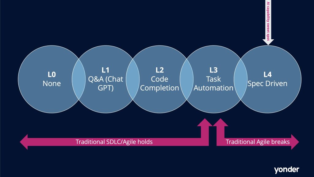 💡 A five-level AI maturity model for projects: from basic AI assistance to fully spec-driven development, where traditional Agile workflows start to break (see below 👇 )